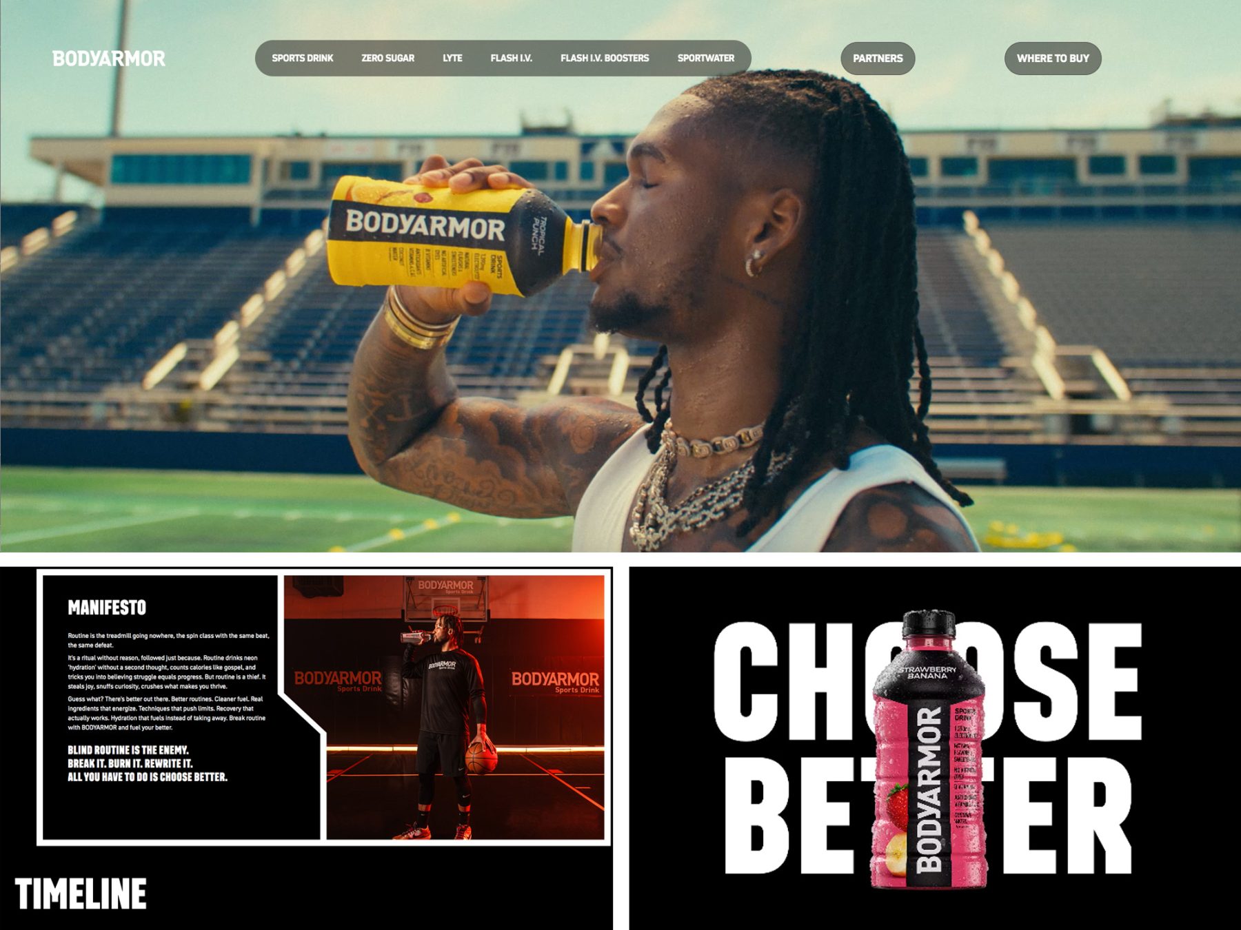 BODYARMOR Sports Drink provides superior hydration with electrolytes, coconut water, and vitamins. No artificial sweeteners, flavors, or dyes. We helped this premium sports drink relaunch their website with a bold, new look complete with large fonts and bright colors on a black canvas.